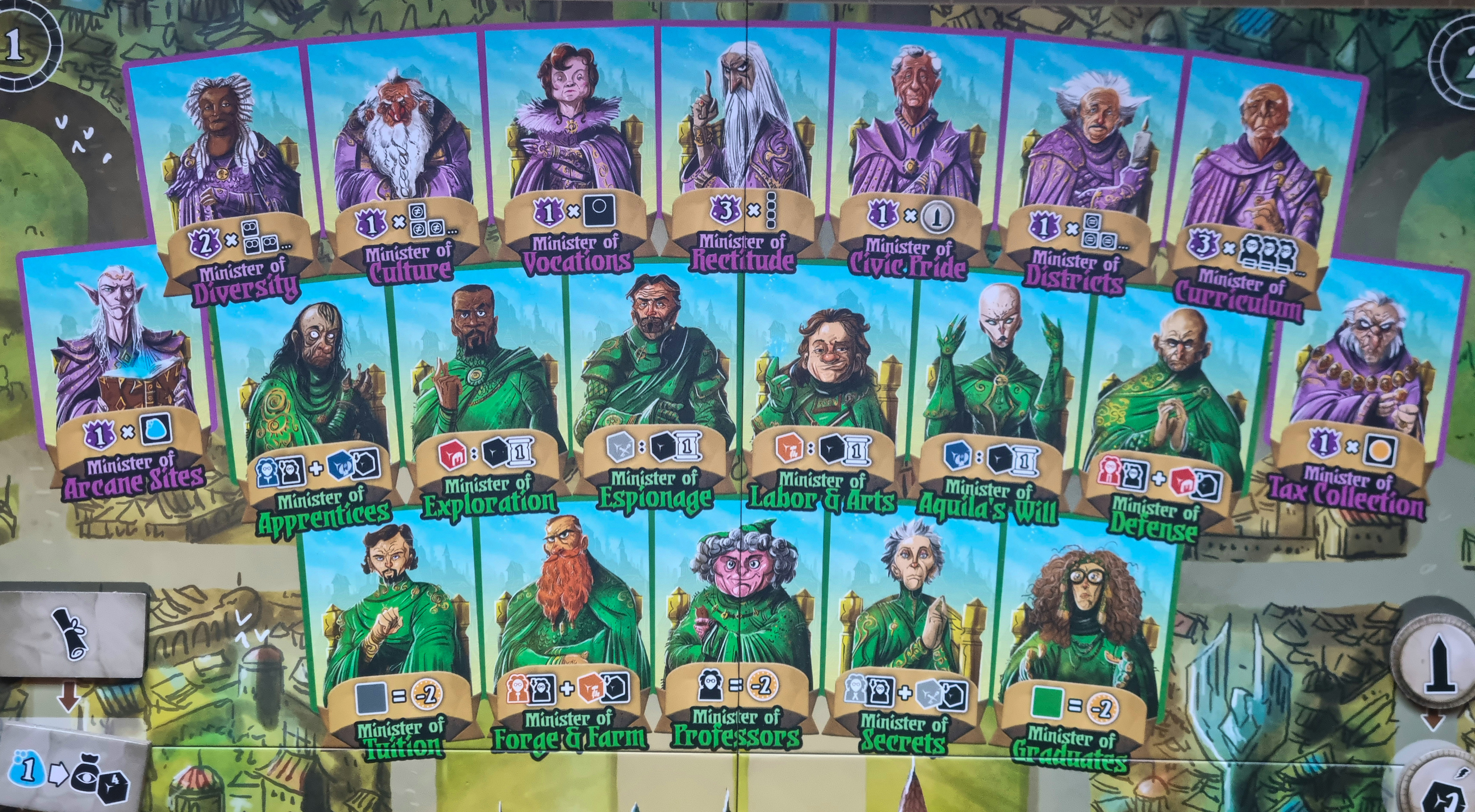 A small abundance of points will be gained throughout the game everytime you perform most classroom actions. The main bulk of points, however, come with end-game scoring. When you choose to pivot your focus onto this type of scoring is very important. The two forms of end-game scoring involve upper council members and prestige tiles. Every time you perform two quests you will gain a prestige tile to add to your tableu. These tiles will score on the amount of guild symbols that appear on other tiles, the position of this prestige tile in relation to certain tiles, and/or the amount of professors you have.